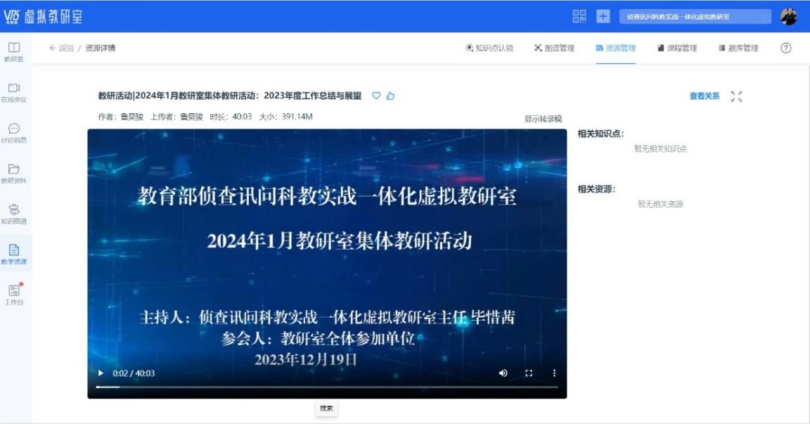 2025年是落实教育部教育数字化战略和公安部全面升级智慧公安建设部署的关键之年,“侦查讯问课程虚拟教研室”将在推动人工智能赋能教学上集中发力,推进建设数字助教、数字教师,为教师、学生备课、自学、咨询提供全流程服务。研发AI虚拟仿真教学工具,着力解决学生实训模拟中的真实情境的问题。进一步加强知识图谱建设,继续进行基于知识图谱的侦查讯问教学实践,有力推进“教学研练战”一体化人才培养模式改革创新。