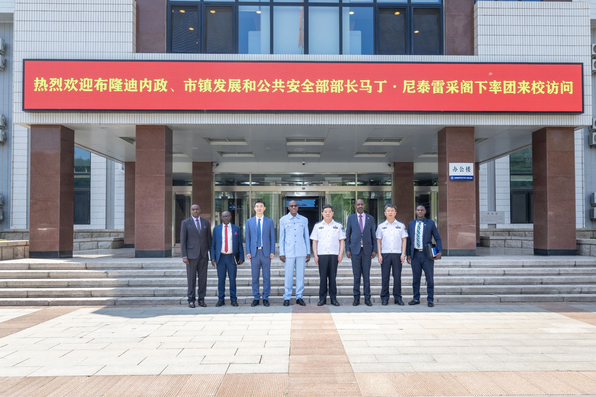 5月21日上午,布隆迪内政、市镇发展和公共安全部部长马丁·尼泰雷采率团来校交流访问,公安部国际合作局副局长高俊义陪同来校。校党委副书记、校长曹诗权,校党委委员、副校长刘东华在木樨地校区会见布隆迪代表团一行,双方就加强执法能力建设领域的交流与合作交换意见。尼泰雷采还参观了学校校史馆,高度赞扬学校办学成就并留下长篇寄语。