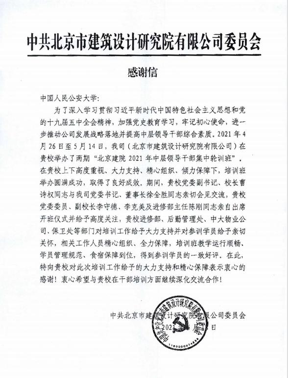 中共北京市建筑设计研究院有限公司委员会发来感谢信