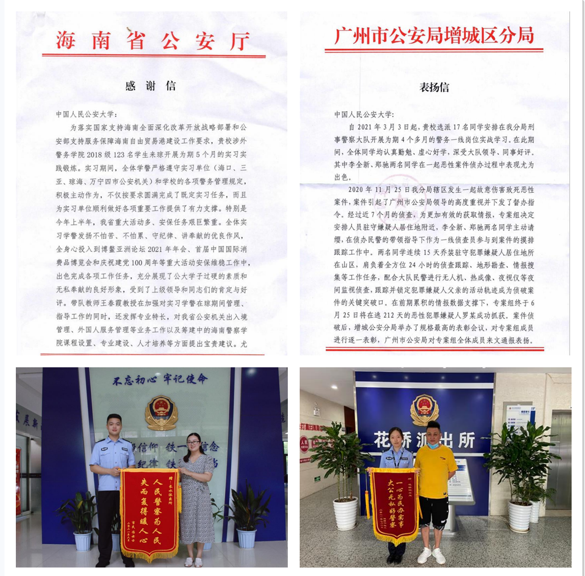 根据人才培养方案和教学工作安排,2021年3月至7月,2018级2360名本科生分赴广州、深圳、杭州等14个实践教学基地,开展为期140天的专业实习。实习师生政治素质过硬,纪律作风优良,勇于责任担当,践行学用相长,力求最好成效,在140天的实习中“零伤亡、零投诉、零违纪、零事故”。各级各类媒体累计10余次对beat365学生实习情况予以关注报道,先后有10余名学生收到群众赠送的锦旗或表扬信,海南、广州、中山、嘉兴等多地公安厅局专门向学校发来感谢和表扬函件。全体实习师生以实际行动和优异表现,获得当地公安机关和人民群众的一致认可和广泛好评,为学校赢得了良好社会声誉。