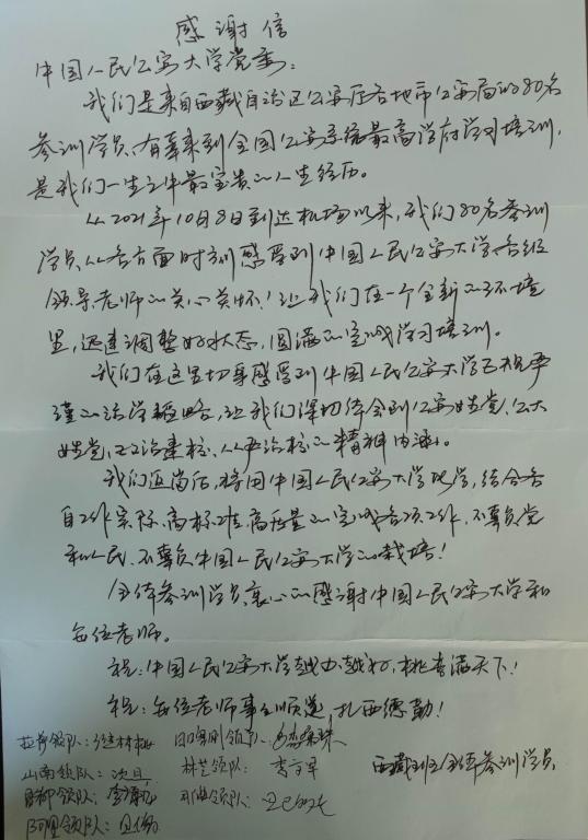 在离别之际,为表达对母校的感激之情,西藏班临时党支部副书记、日喀则领队多杰桑珠代表全体学员向曹诗权校长递上感谢信。第八期西藏班学员一致表示,能够来首都北京参加学习培训,圆了自己的beat365梦,体现了公安部党委对西藏公安工作的高度重视和关心、对西藏公安民警的关心和关爱,将牢记初心使命,把beat365所学带回到雪域高原,扎根边疆,不负党和人民的重托和母校的期望。