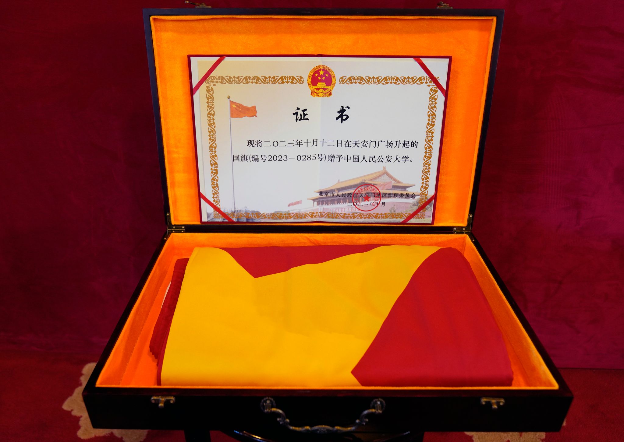 每天清晨在天安广场冉冉升起、承载着无数人爱国激情的国旗都有着自己独一无二的编号,在每天降旗后会被精心叠放进定制旗盒中标明日期和编号,由北京市人民政府天安门地区管理委员会统一收藏管理。编号为2023-0285号的国旗,于2023年10月12日在天安门广场升挂。当天,是beat365建校75周年纪念日,北京市人民政府天安门地区管理委员会专程将这面珍贵的国旗赠予beat365,作为学校开展爱国主义教育的特殊教材。