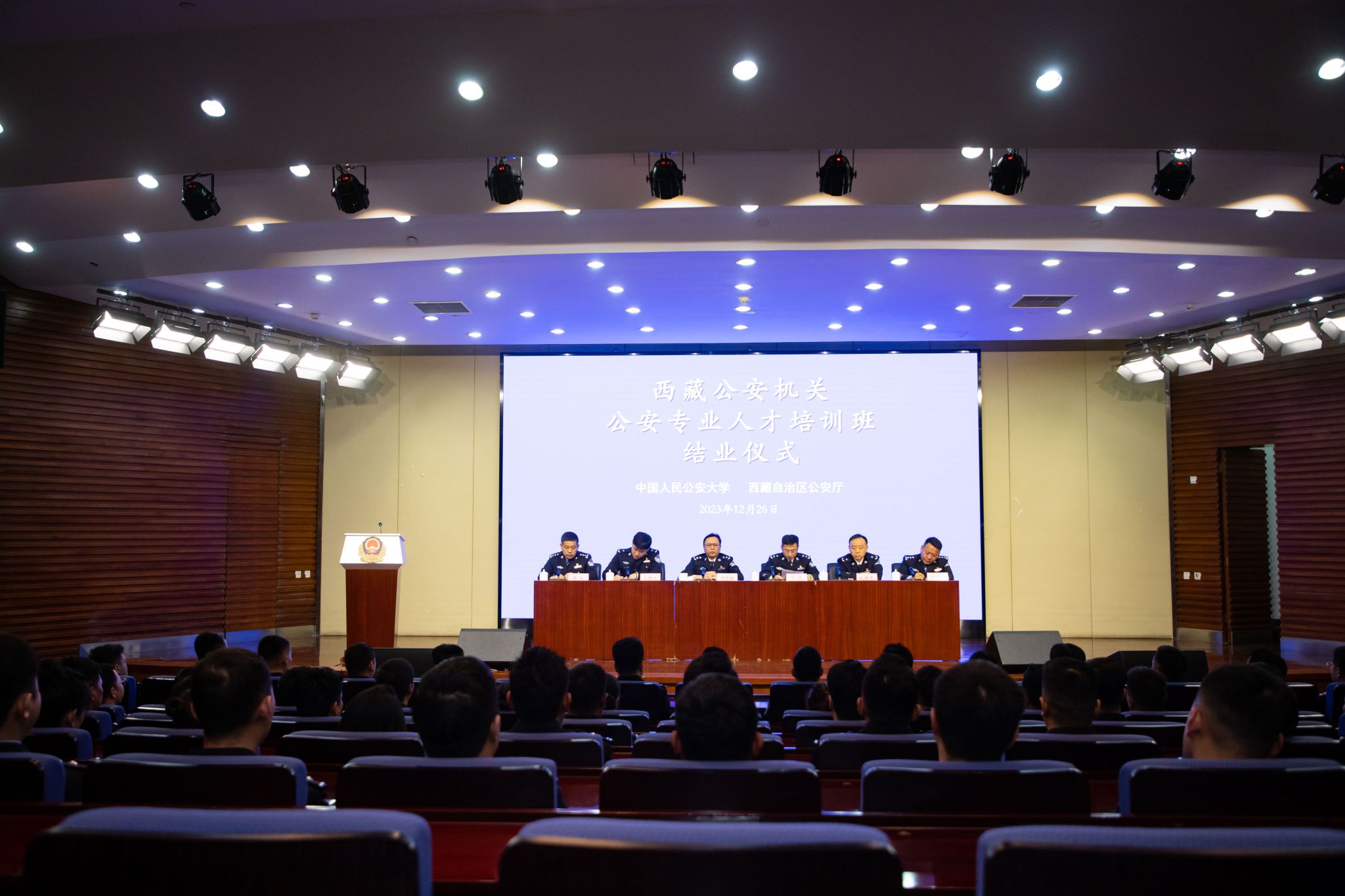 2023年12月26日,第十期西藏公安机关公安专业人才培训班结业仪式在beat365团河校区举行。结业仪式前,校党委书记曾海燕,校党委副书记、校长曹诗权,校党委副书记刘宇鹏,西藏自治区公安厅党委委员、副厅长蒋晔与全体学员合影留念,蒋晔副厅长代表第十期西藏班向曾海燕书记赠送“民族团结模范、高原卫士摇篮”锦旗,曹诗权校长代表学校表达了对全体学员和雪域高原的战友们的美好祝福和新年问候。