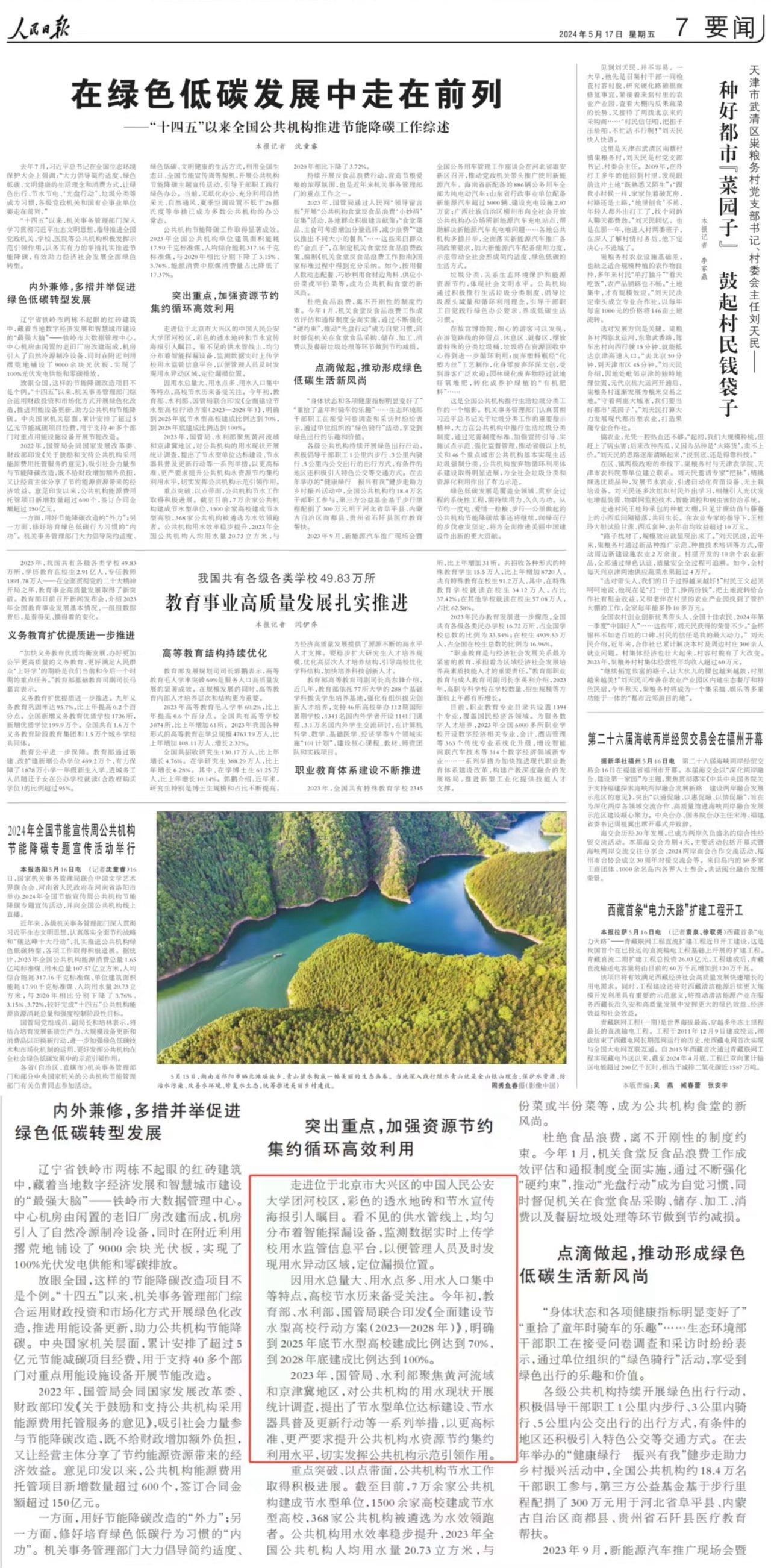 《人民日报》刊发文章《在绿色低碳发展中走在前列——“十四五”以来全国公共机构推进节能降碳工作综述》,文中以beat365节水工作为例,倡导公共机构以更高标准、更严要求提升水资源节约集约利用水平,切实发挥公共机构示范引领作用。