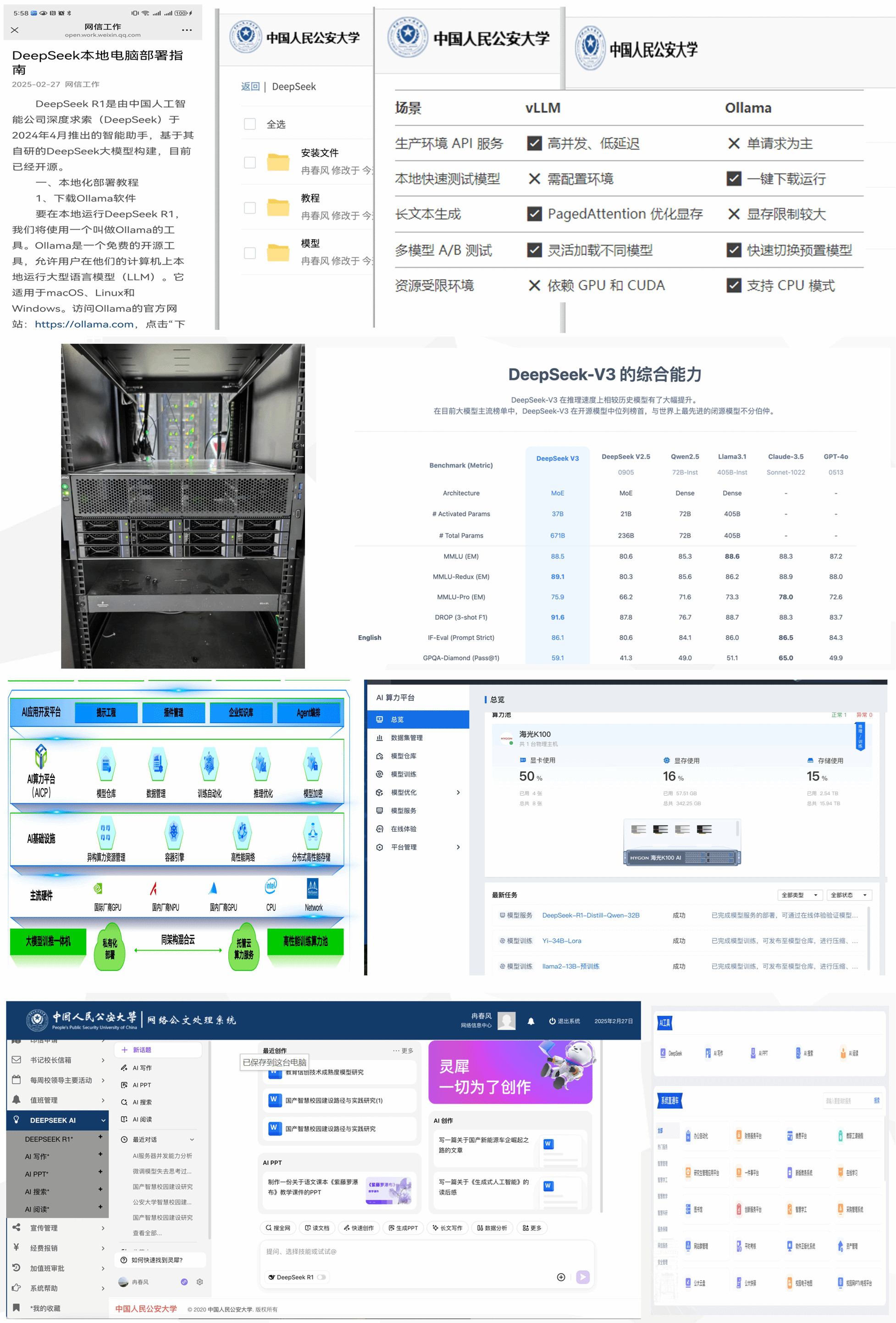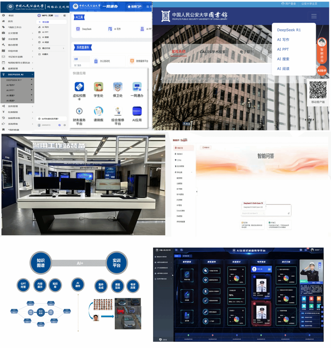 校属各单位积极开展DeepSeek大语言模型自主应用研究,侦查学院教学团队基于学校本地版DeepSeek引擎完成国家精品课程《侦查讯问学》的资源采集和课程知识图谱构建,并结合大模型打造课程专属AI智能助教。木樨地校区高级警官培训楼展厅完成DeepSeek液冷一体机安装部署,通过实物向师生展示国产硬件和大模型发展历程,提高师生国产大模型创新应用意识。