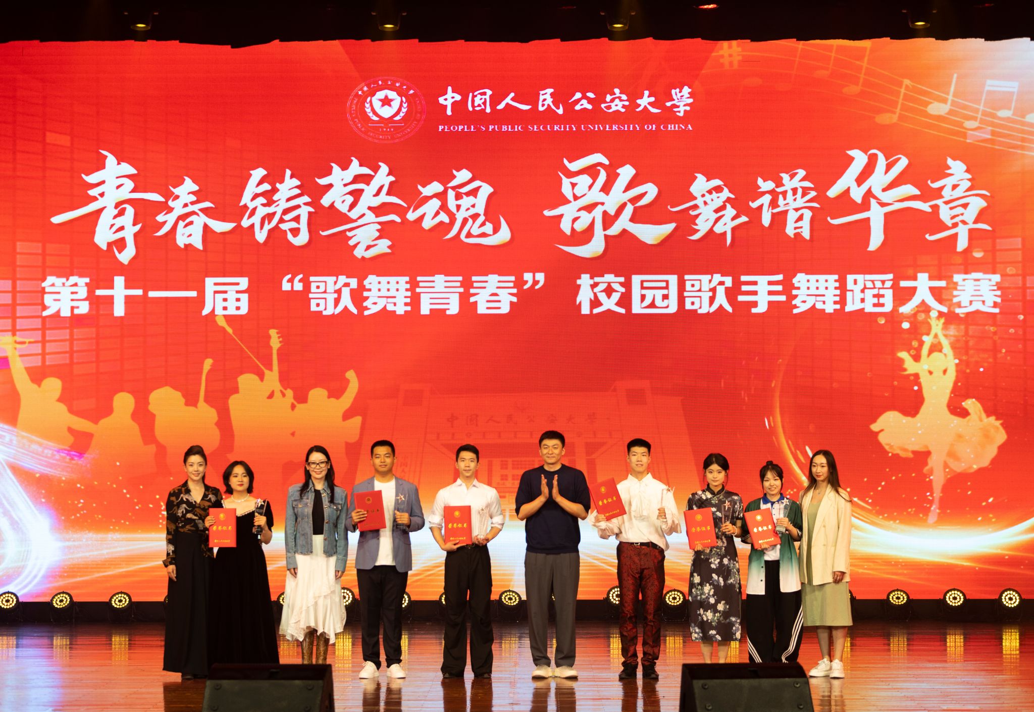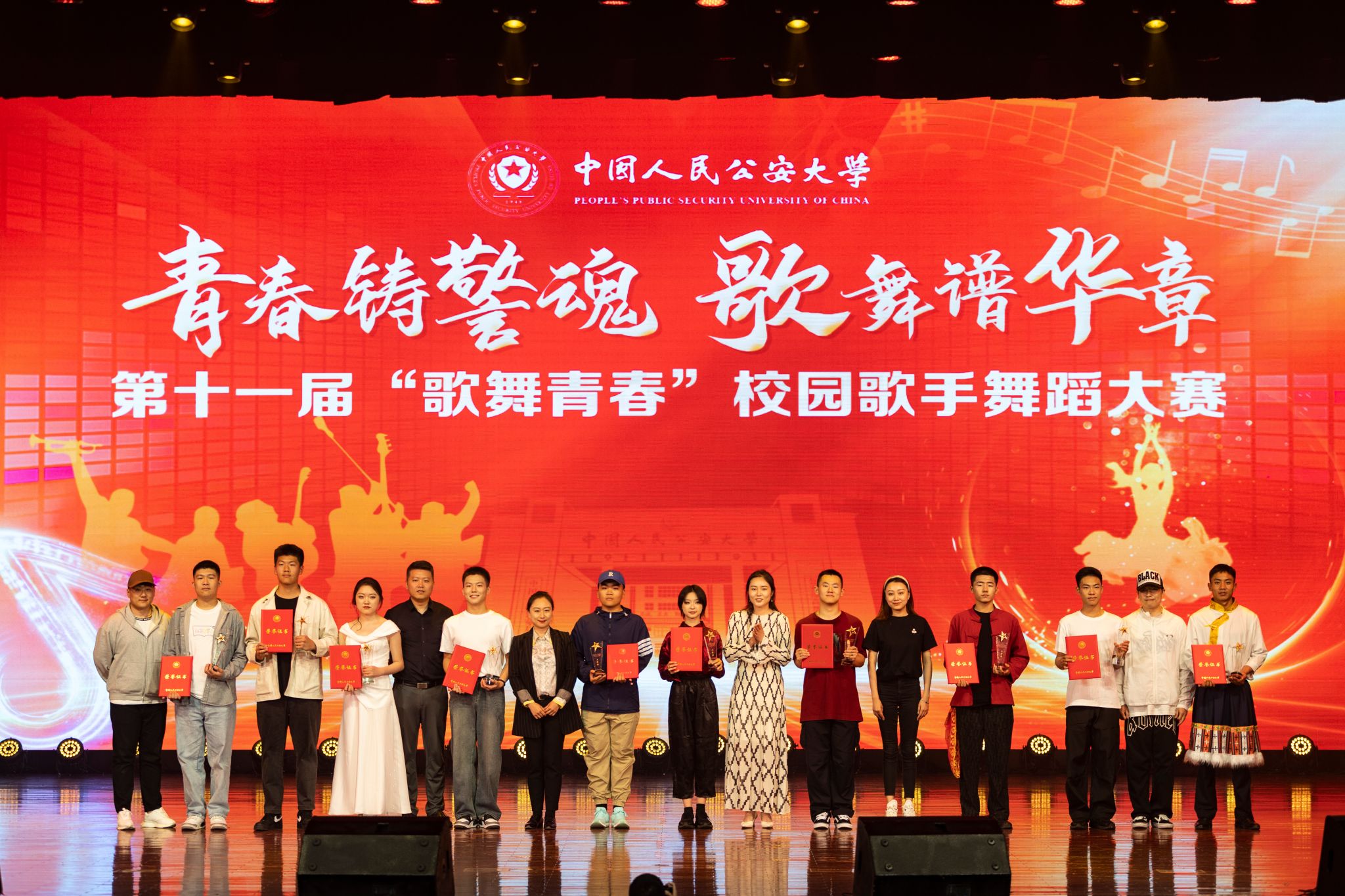 大赛分为歌手组与舞蹈组两大类别,经过前期选拔,来自各学院的20组选手脱颖而出晋级决赛,他们以声传情、以形达意,为师生们呈现了兼具艺术价值与思想深度的精品节目,共4组作品凭借深刻立意与精湛表现摘得桂冠:舞蹈《共产主义接班人》以铿锵舞姿展现新时代青年与时代同频共振的精神风貌;舞蹈《雪崩》用肢体语言直面校园霸凌议题,诠释双向救赎的生命力量;歌曲《麒麟》以热血旋律重绘青春意气,彰显预备警官的侠骨柔情;歌曲《给电影人的情书》以深情唱腔致敬光影筑梦人,传递对艺术精神的崇高礼赞。大赛还评选出6组二等奖与10组三等奖。在特别环节,离退休工作处与关心下一代工作委员会的教师代表为在场师生献上朝鲜族经典舞蹈《千里马展翅飞翔》,以曼妙舞姿展现少数民族文化魅力,传递出对美好生活的热烈向往,将现场气氛推向高潮。
