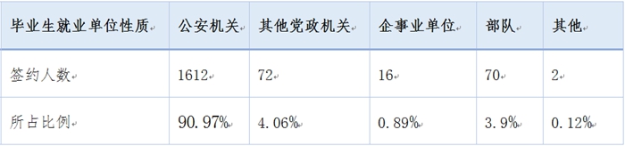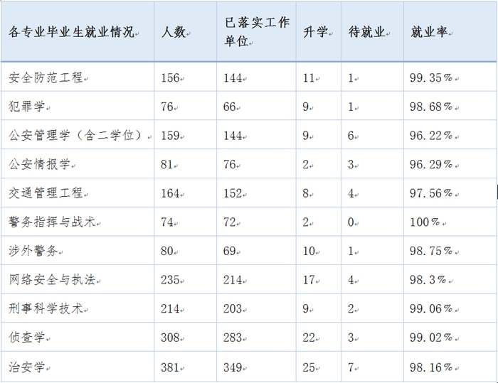 截至2016年12月21日,2016届本科生就业率为98.34%。其中124人考取研究生,占6.43%,1612人在公安机关就业,入警率为90.97%。