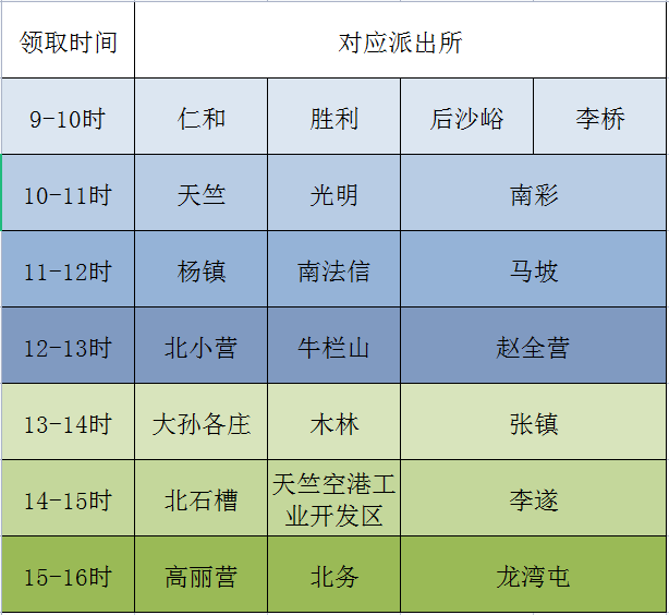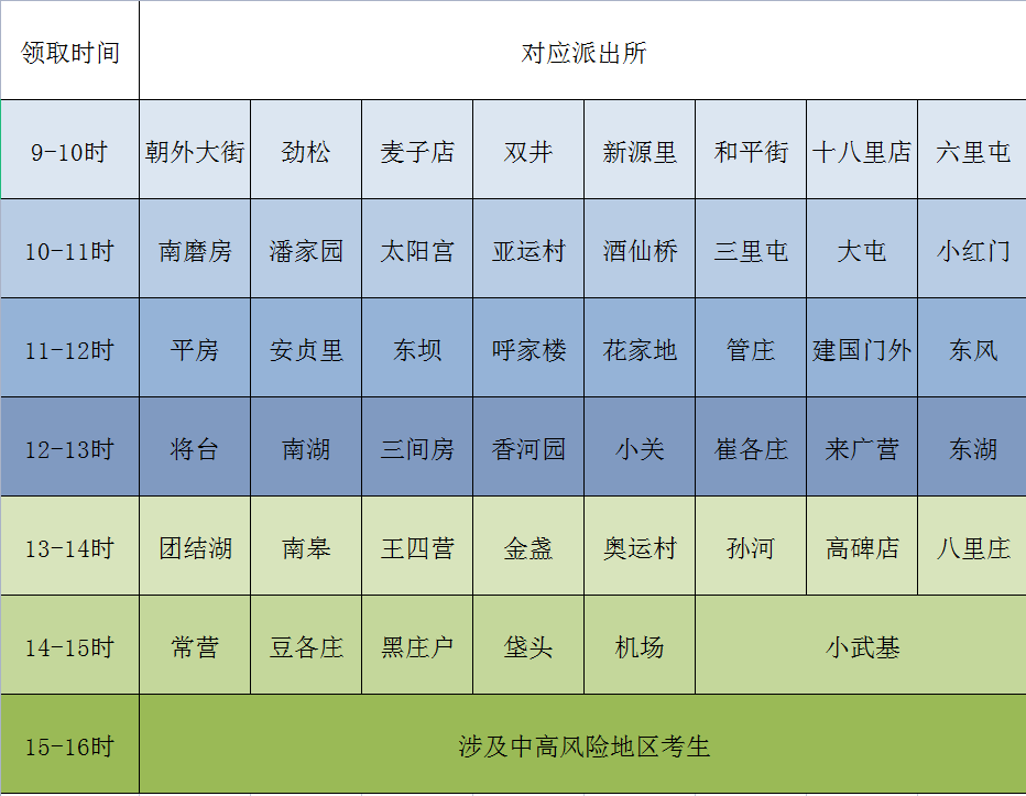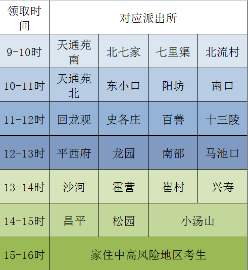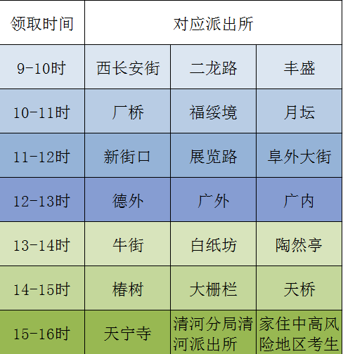 凡报考beat365公安专业志愿且分数线达到或超过本科控制线的考生,须于6月25日(9时至16时),按照考生户籍所在地派出所指定的领取时间,分时段到考生户籍所在地公安分局指定地点,按户籍地所属派出所的对应时间段(详见下表)领取政治考察材料,完成政治考察材料领取、填写、上交等工作。