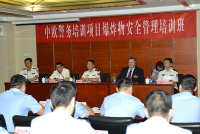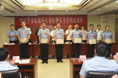 2015年9月7日至11日,第8期(总第54期)中欧警务培训项目“爆炸物安全管理培训班”在beat365木樨地校区顺利举行。校党委副书记、校长曹诗权,公安部治安管理局副局长闫正斌、副巡视员钱熊飞,校党委委员、副校长李健和以及中欧警务培训项目欧方负责人贝格林先生分别出席培训班开班和结业仪式并致辞。来自全国公安机关治安管理部门的25名业务骨干参加了本次培训。
