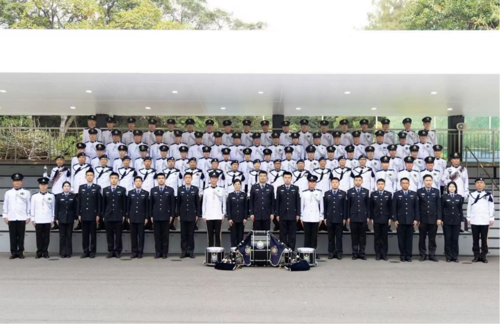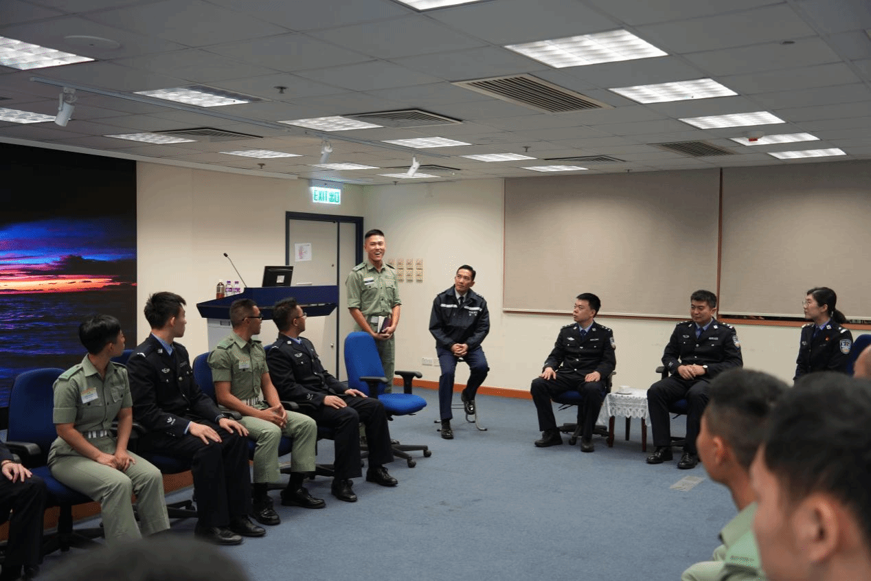 23日上午,参访团一行在香港警察学院参加交流活动。香港警察学院张健斌警司详细介绍了香港警察学院的发展历程、教学体系设计与培训成果。随后,参访团师生前往训练场观摩香港警察学院结业仪式排练。结业队列分列式在风笛乐队的伴奏下进行,香港警察学院学员们身姿挺拔、步伐整齐,展现出高度的纪律性和专业素养。