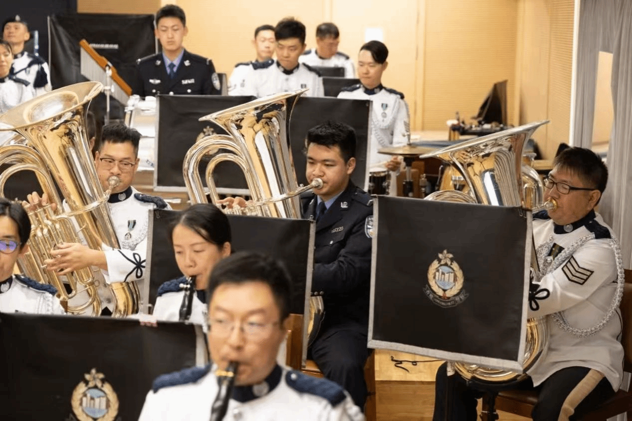表演结束后,师生团一行走进乐队排练室,警乐团音乐总监何颂贤督察详细介绍了乐队的相关情况,包括特色鲜明的制服设计、分工明确的乐队架构、丰富多样的演出类型以及未来的重点工作计划。其中,警察乐队的特色品牌“警察乐队少年团”、“乐韵警声亮校园计划”让参访团耳目一新。之后,beat365警乐团的学生代表演奏了《我爱你,中国》、《海阔天空》、《云宫迅音》等经典曲目。经过近期多次港澳音乐交流的锤炼,受到香港警察银乐队和风笛队的鼓舞,警乐团成员配合愈发默契,合奏表现愈具张力,献出此行最完美的一次表演。随后,双方乐队合奏经典曲目《我和我的祖国》、《中国人民警察警歌》、《灯火里的中国》、《东方之珠》和《歌唱祖国》,奏出了对内地与香港人民血脉相连的深情礼赞,以及对祖国繁荣昌盛的歌颂和展望,现场气氛热烈,掌声不断。