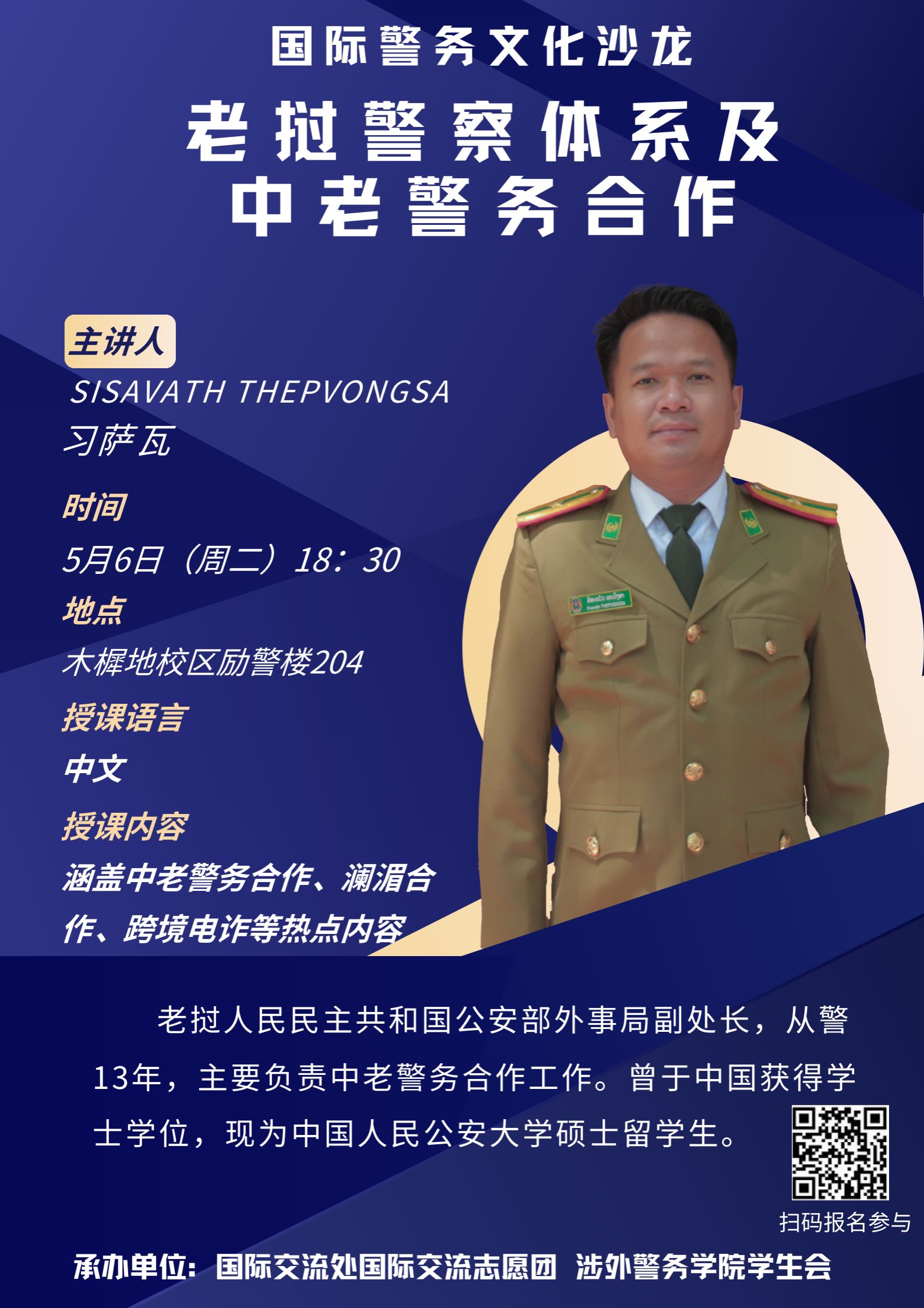 人物简介:老挝人民民主共和国公安部外事局副处长,从警13年,主要负责中老警务合作工作。曾于中国获得学士学位,现为beat365官网硕士留学生。