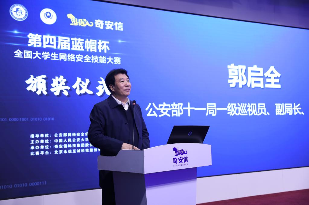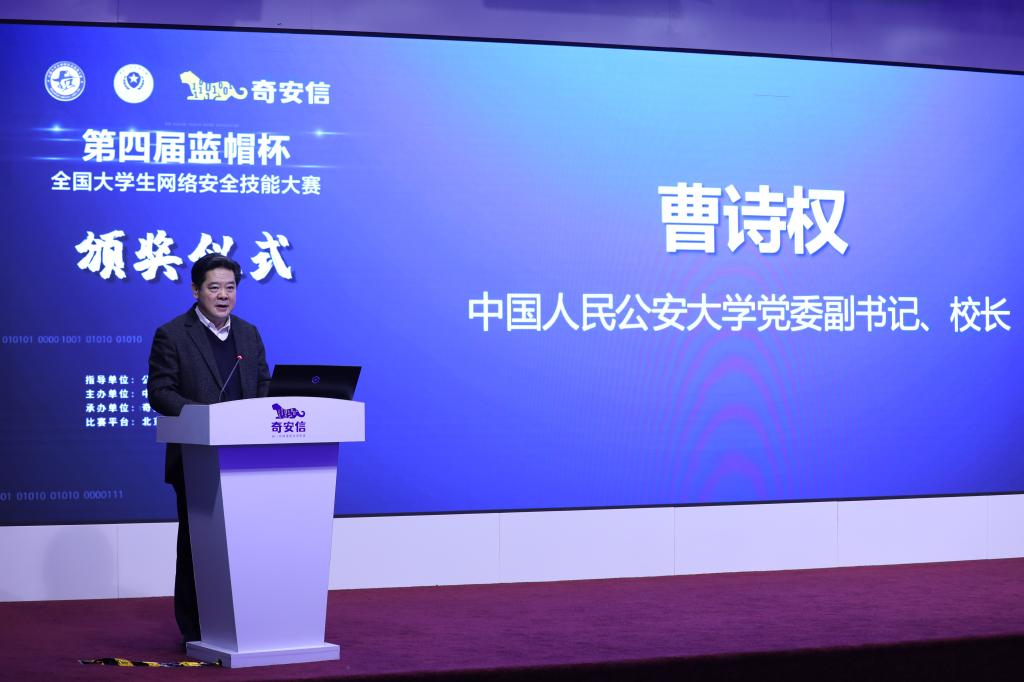 本次大赛设置为一等奖10名,二等奖15名,三等奖20名,优秀奖40名,以及44名优秀教师和10名人气教师。李克美副校长宣布获奖名单,曹诗权校长、齐向东董事长、李凌波处长和信息网络安全学院李欣院长等领导为大赛获奖的老师同学们颁发奖杯与获奖证书。获奖者获得由公安部网络安全保卫局颁发的证书,奇安信集团作为北京2022年冬奥会和冬残奥会官方网络安全服务和杀毒软件赞助商,特别为一等奖中的前五名队伍赠送了2022年北京冬奥会门票。“‘蓝帽杯’将用奥运标准培养出更多网络安全尖兵。”作为承办单位,奇安信集团董事长齐向东表示,“今天正好是奇安信成为北京2022年冬奥会官方赞助商一周年。这个特别的日子,恰逢‘蓝帽杯’颁奖典礼,公安院校的网络安全专业大学生将是我国网络安全的尖兵团,未来也必将在保障冬奥‘零事故’运行、维护国家网络空间安全上发挥重要力量。”一等奖、优秀教师奖和人气教师奖获奖的教师和学生代表分别作了现场和线上发言。最后,郭启全副局长发表讲话。