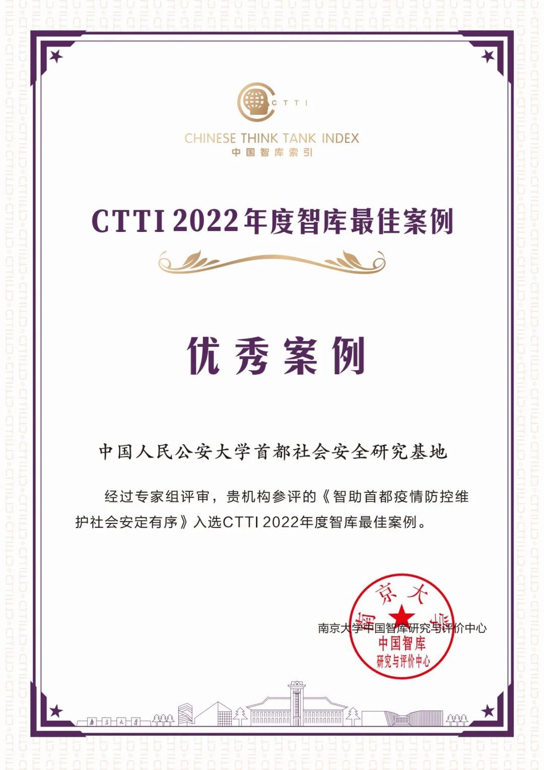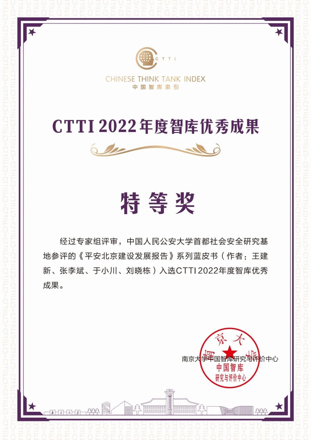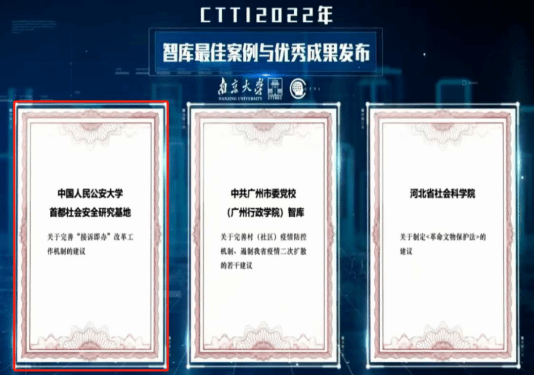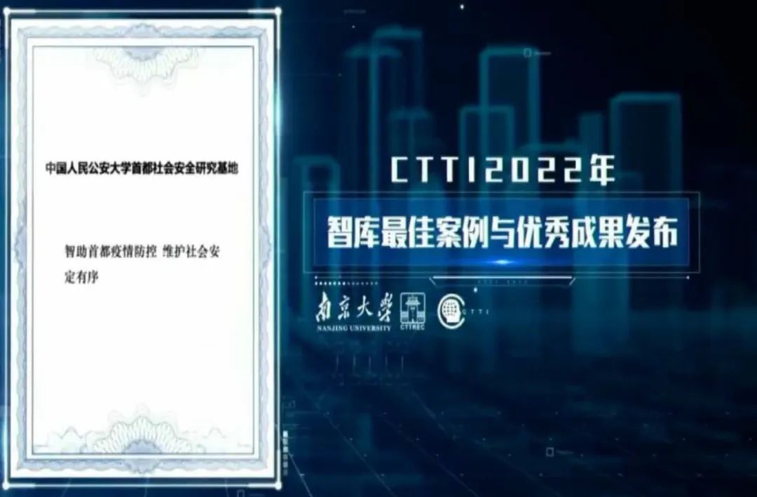 研究基地报送的智库建设案例和优秀成果均获奖。其中研究成果《平安北京建设发展报告系列蓝皮书》获评“CTTI 2022年度智库优秀成果特等奖”。