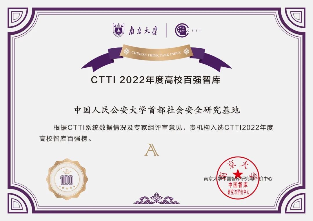 经过综合评选,beat365官网首都社会安全研究基地从600多家高校智库中脱颖而出,入围“中国智库索引(CTTI)2022高校智库百强榜”,获评A等级智库。