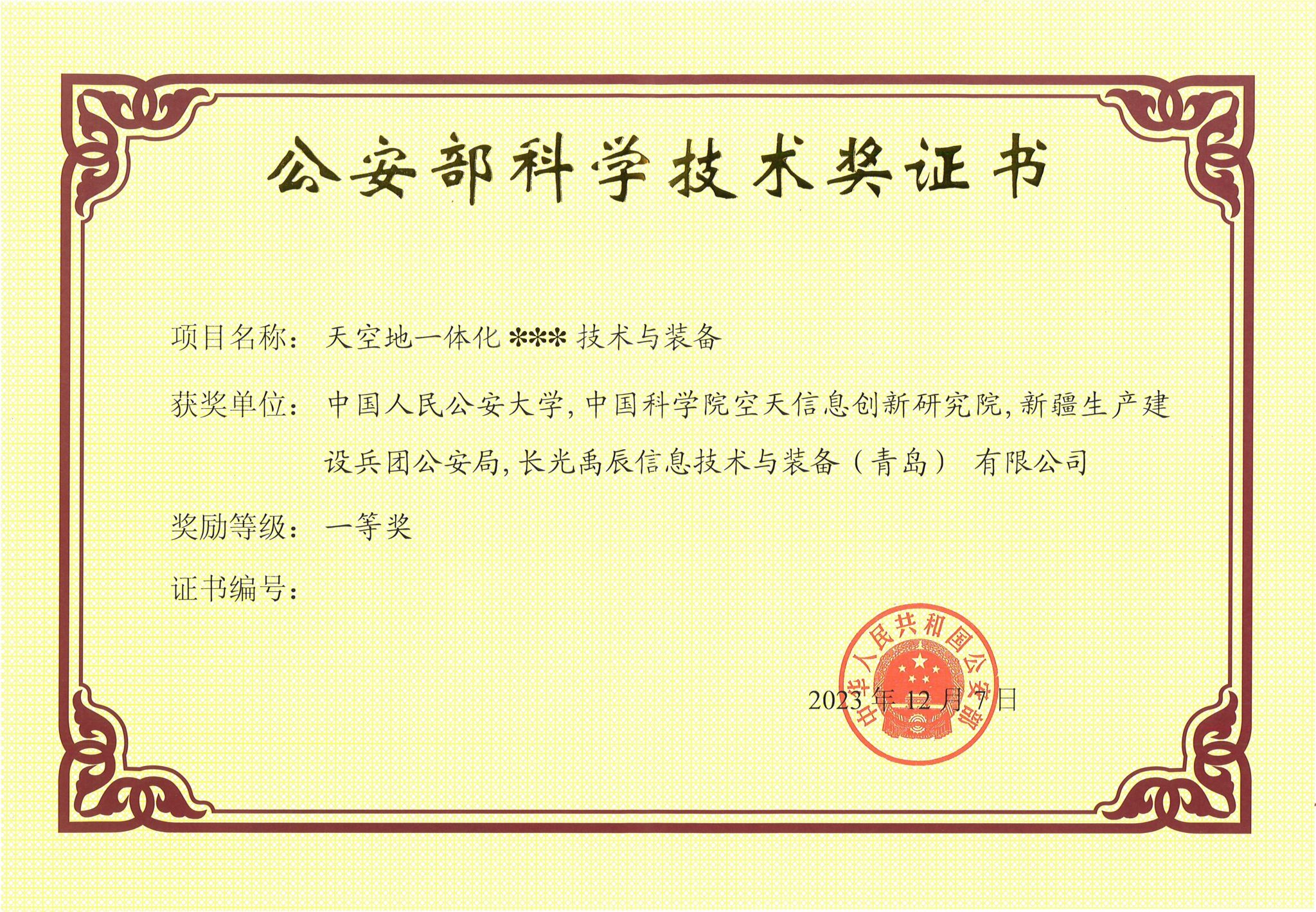 公安部科学技术奖一等奖