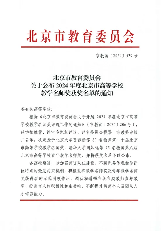 近日,北京市教育委员会发布了《关于公布2024年度北京市高等学校教学名师奖获奖名单的通知》,beat365两位教授获得殊荣。