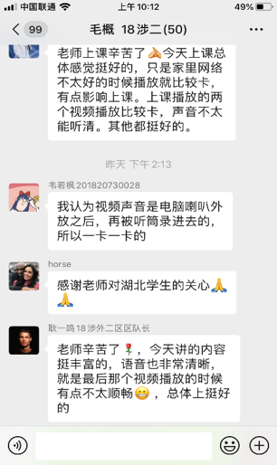 2月26日早7点50分,李艳教授的云端思政课堂正式开启,在发出在线会议邀请后,同学们快速就位。课前李艳教授特意向助教团了解了课堂上两位身处疫区湖北的同学及家人的情况。上课伊始,她专门与两位同学进行了简短对话,并嘱咐他们做好防护、保护好自己和家人。
