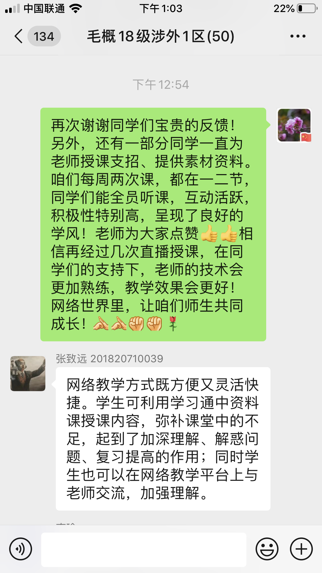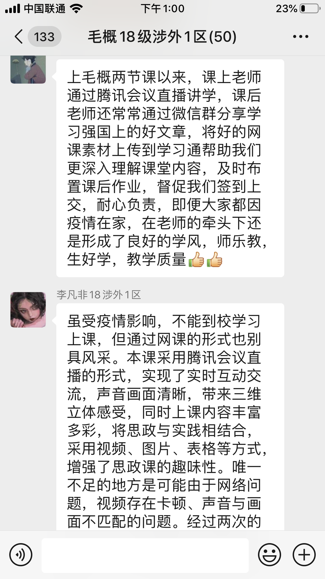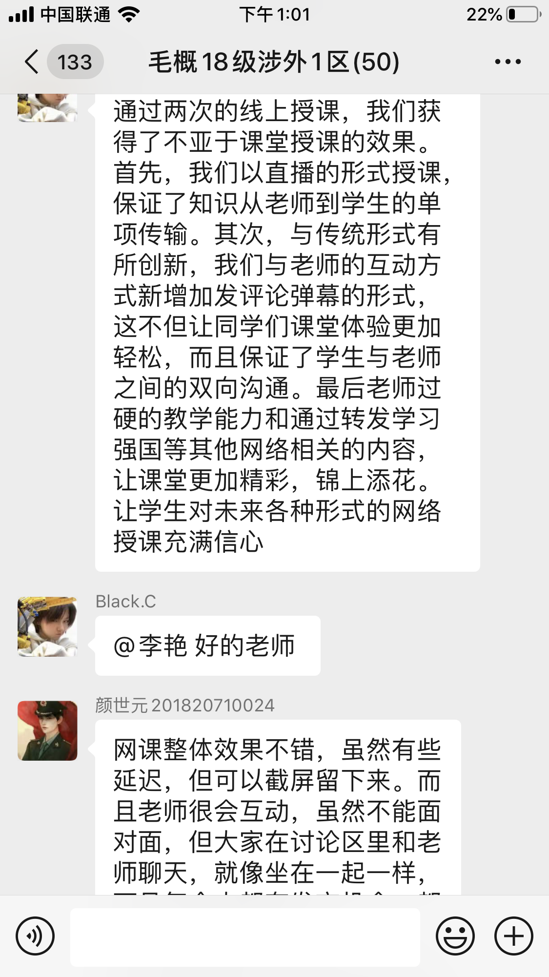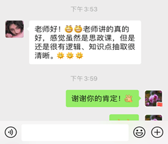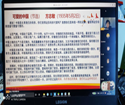 在完成课程导论部分的内容后,李艳教授结合党的理论政策教育和现实国情教育这门课程任务定位,马上提出:举国上下正在进行的疫情防控的人民战争、总体战和阻击战,是当下中国最大的国情,是第一位的任务。在前期学生掌握抗疫基本材料基础上,她用《武汉保卫战》的视频帮助同学们全景式地回顾了全民抗疫、众志成城的奋斗历程,并提出5个问题让同学们在学习通讨论区回答:最为感动的群体、最敬佩的人物、最骄傲的事例、最不满意现象、最值得反思的问题,引导学生深入辩证地思考这场突如其来的疫情,切身感受这场大考带给自己的生命教育、责任教育和感恩教育。为进一步激发学生的爱国主义情怀,她又介绍和引用了鲁迅先生关于“民族脊梁”名言内容和写作背景,并播放了自己为思政课微信公众号2018年“红七月”活动录制的配乐朗诵:方志敏烈士《可爱的中国》(节选),激励学生把个人命运与祖国民族命运紧密相连。在课程最后,她用《坚信爱会赢》这首歌表达抗击疫情必获全胜的坚定信心,并请同学们进一步思考并引出下一次的教学主题:中国必胜的信心来自哪里?