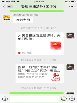 李艳教授本学期承担本科18级《毛泽东思想和中国特色社会主义理论体系概论》课。在明确采用线上教学的方式后,她与教研室、课程组的老师们反复交流沟通,请教网络技术使用娴熟的同事精心进行备课准备,在学习通平台建课建班级。她第一时间通过中队长联系上学生,组建了班级课程微信群。在学习通和班级微信群里,她上传的第一份资料就是《大学生该如何面对肺炎疫情》的微视频,随后陆续将反映抗疫中典型事例的视频、重磅理论文章等资料发布到学习平台和微信群里,并提前布置了开放性作业:让同学们写一篇具有真情实感的关于抗击疫情的心得体会,引导学生多角度关注思考这场突如其来的大考。她从开展现实国情教育和政策国情教育的角度,把抗击疫情的人民战争大课堂与她的《毛泽东思想和中国特色社会主义理论体系概论》这门课的小课堂有机结合起来,形成同频共振。